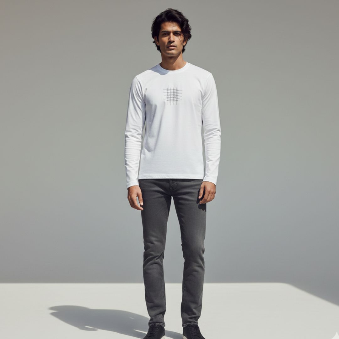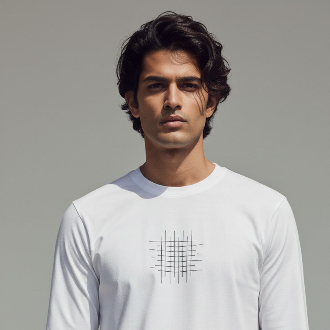 White Full Sleeve T-Shirt – 100% Cotton - Grid Hash Chest Design