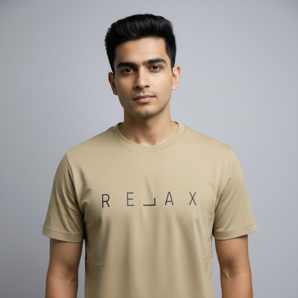 Unwind in comfort with our beige half sleeve “RELAX” tee, made from ultra-soft, breathable cotton with a washed finish for a smooth feel. Featuring a minimalistic screen-printed ‘RELAX’ design, this versatile round neck t-shirt is perfect for laid-back days, casual outings, or weekend lounging.